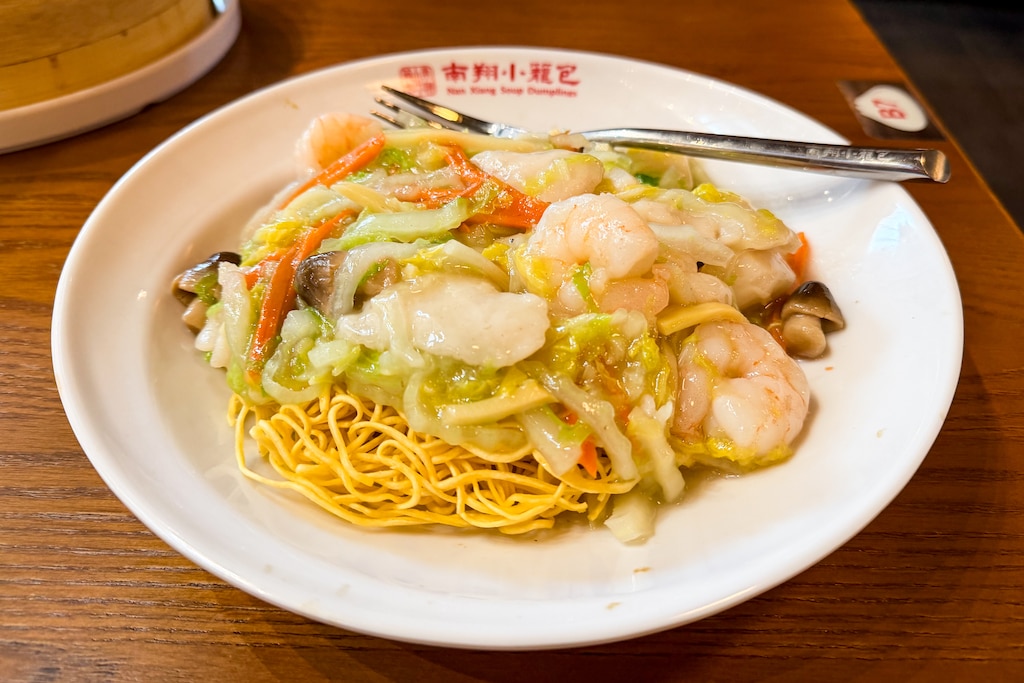 The dining room was half-full on a recent Wednesday visit just after lunchtime, with no wait for a table. The server suggested one of his favorites: pan-fried crispy noodles with seasonal seafood. It was a fine effort of crackling egg noodles topped with shrimp, scallops and a whitefish, which the server couldn’t immediately identify, swimming in a clear sauce of shredded cabbage and carrots with straw mushrooms.