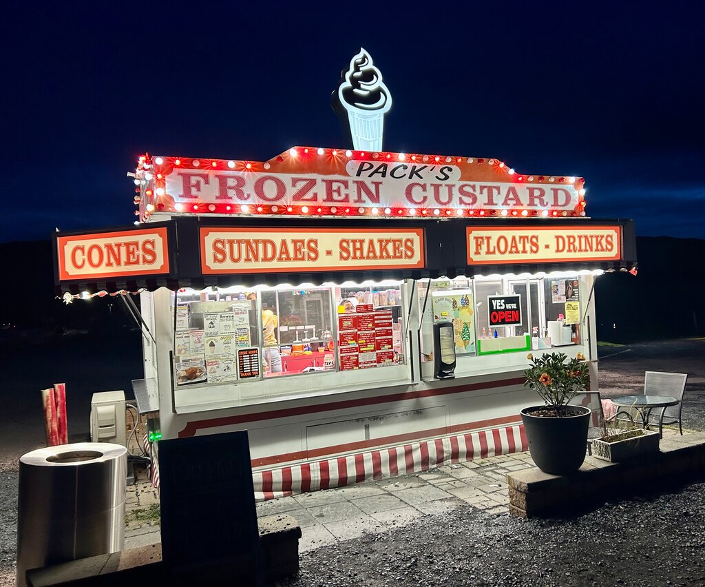 For dessert we stopped at Pack’s Frozen Custard, a county fair-style trailer that lit up the dark highway back to our rental near New Market. Pack’s has an old-school vibe and seemingly endless combinations of ice cream, toppings and presentations.